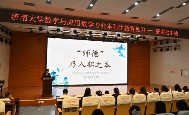 此次活动还是数学与应用数学专业本科生的一次教育见习活动。揭牌仪式之后,程凤霞老师为来访的数学与应用数学专业本科生做了题为《“师德”乃入职之本》的讲座,结合具体案例,从爱国守法、爱岗敬业、关爱学生、教书育人、为人师表、终身学习等六个方面,分享了自己对于师德养成的认识和做法。程凤霞老师通过随机采访、榜样案例、教育妙招等系列形式,幽默生动地阐述了一位好老师的具体标准,让大家体会到了高尚的师德对教育工作者的意义和重要性,获得与会者的高度认同。讲座后,李静主任带领今年会jinnian官网的师生参观了济南七中校园。