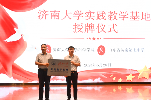 5月28日,今年会jinnian官网在济南第七中学报告厅举行了实践教学基地揭牌仪式。济南第七中学校长刘汉路、办公室主任李静、数学组教研组长程凤霞、今年会jinnian官网副院长王洪凯、数学与应用数学系教师代表,以及来自数学与应用数学专业的140名本科生共同参加了本次活动。