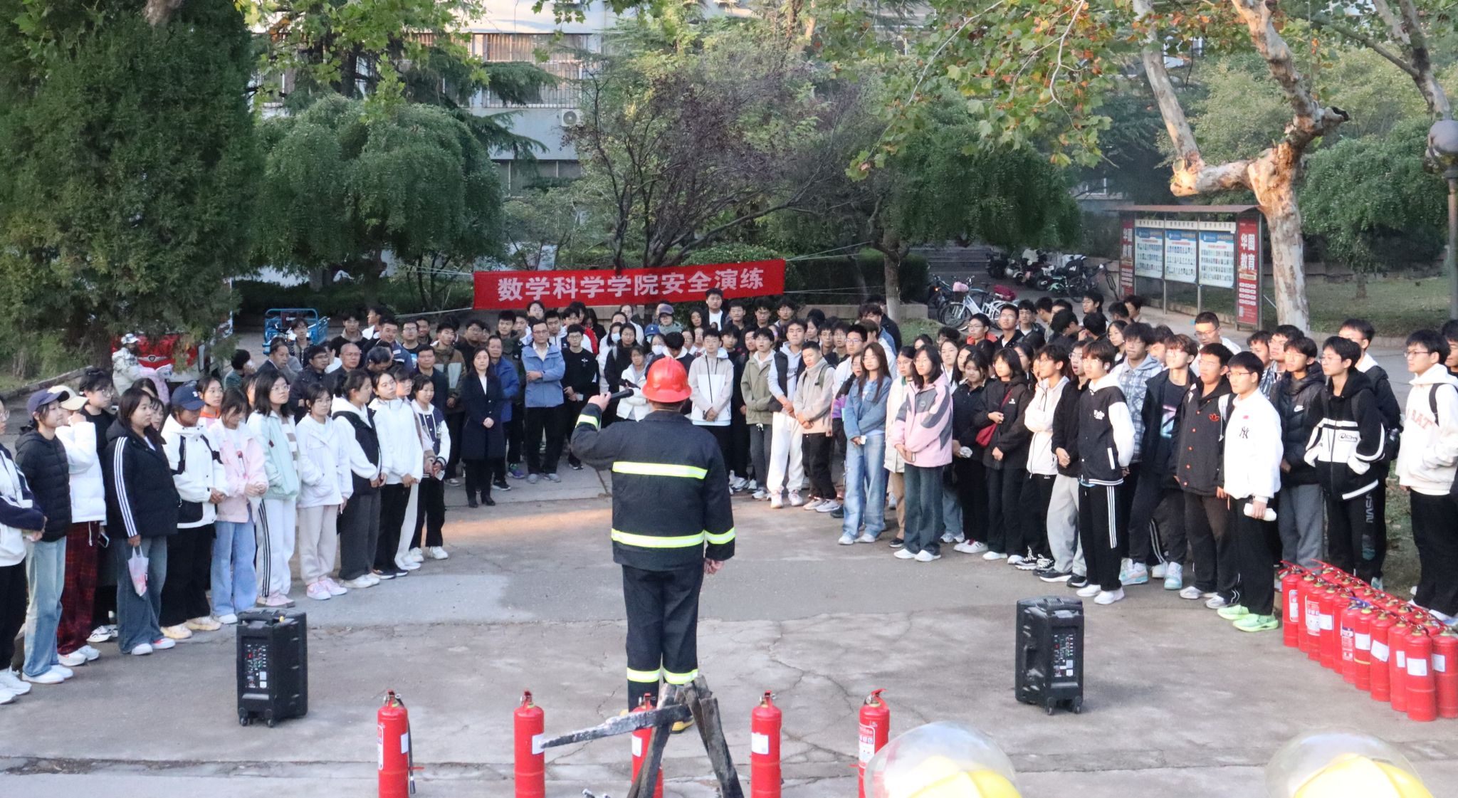 本次活动通过理论与实践结合的方式,演练开始前,安全管理处消防科工作人员重点围绕模拟火灾逃生、灭火器使用方法等方面讲授消防知识,让师生熟悉应急疏散的正确方法,讲明演练的程序、内容、时间和纪律要求,以及各个疏散的路线和到达的区域,确保演习的顺利展开。