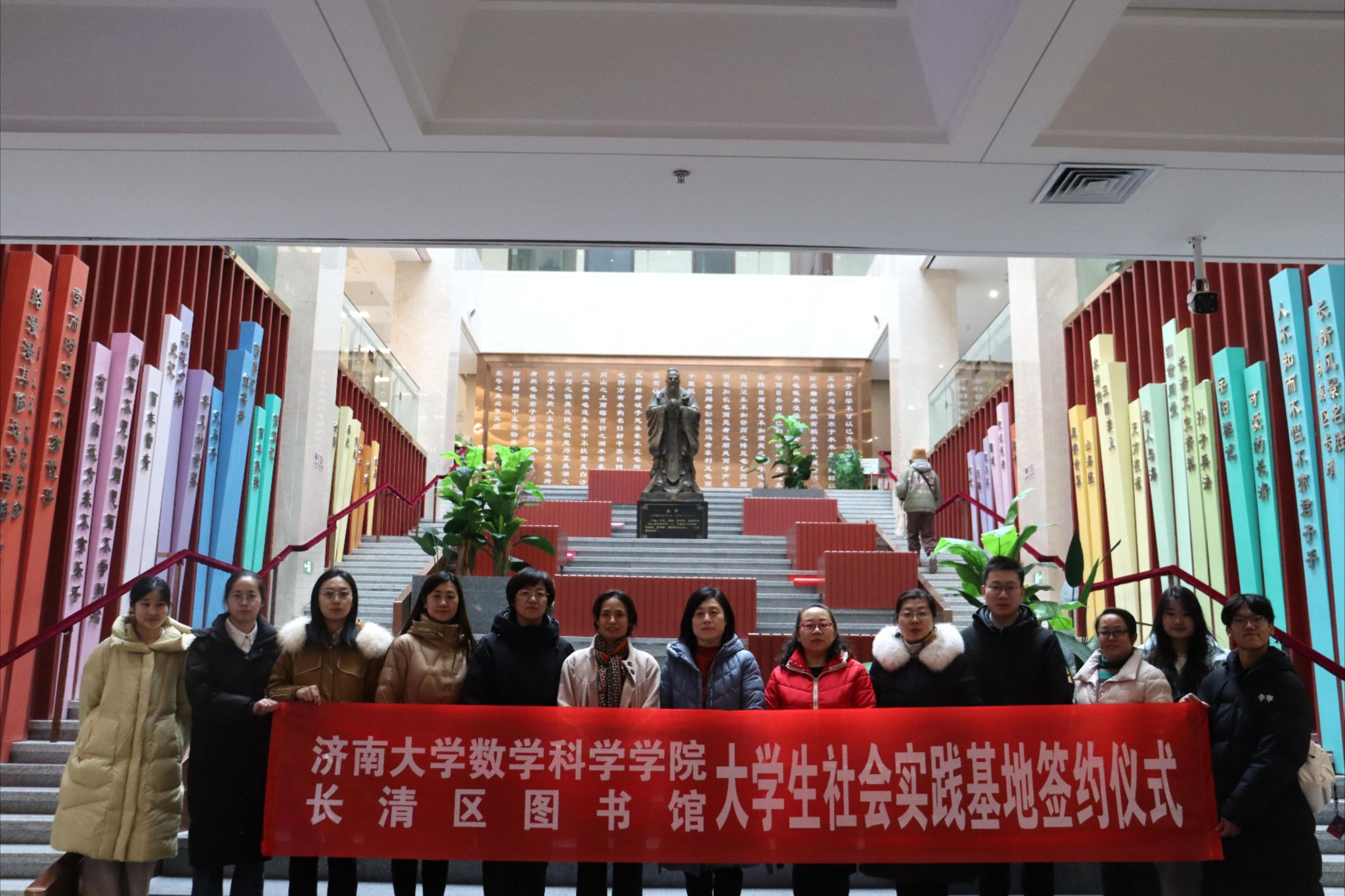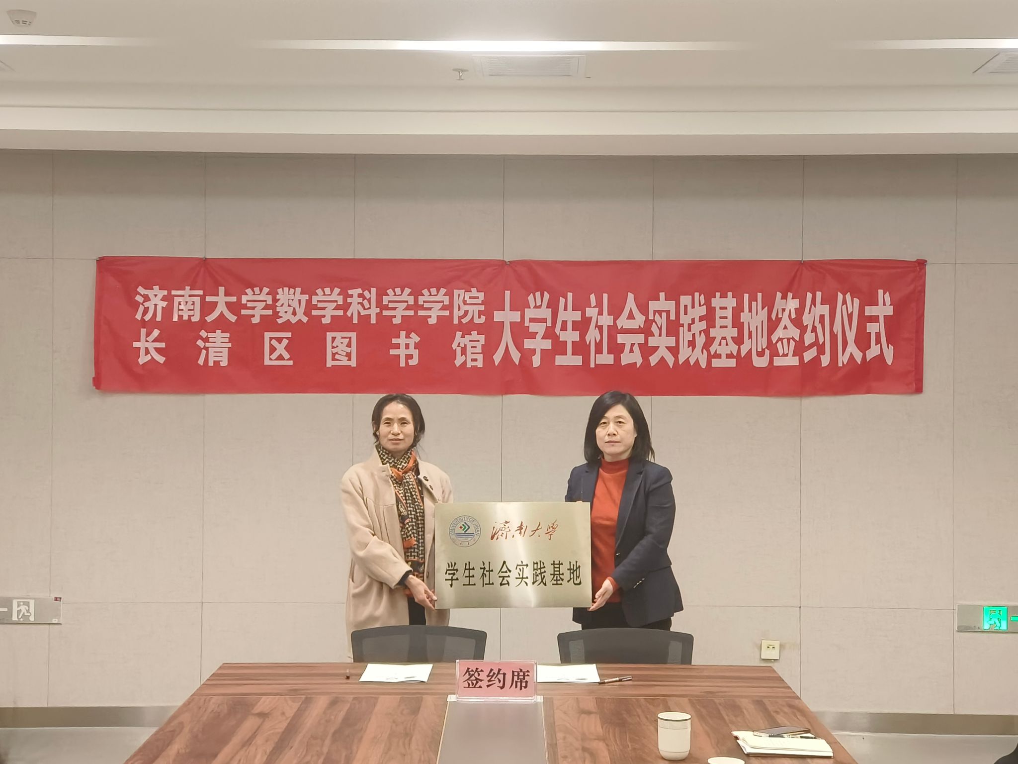 2025年1月11日下午,今年会jinnian官网与长清区图书馆共建大学生社会实践基地签约挂牌仪式在长清区图书馆举行。长清区图书馆馆长杨洪霞、今年会jinnian官网党委书记崔英静、双方相关工作人员及学生代表参加活动。