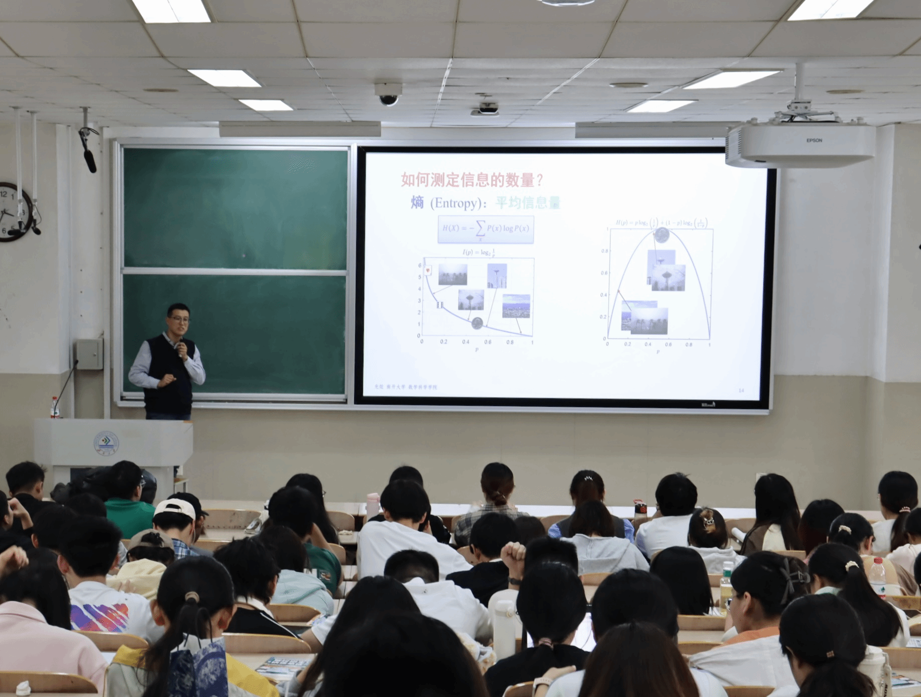 光炫回顾了信息论的背景和历史,介绍了信息论之父香农,从“什么是‘信息’”、“如何刻画信息的数量”两个基本问题入手,讲解了“信息”和“信息量”的数学定义是如何建立的,进一步阐述了信息论在生活中的应用以及与其他学科的交叉与联系、信息论未来的研究方向。光炫结合自身科研经历,深入浅出地讲解了现代数学理论的发展脉络及其在人工智能、密码学等领域的创新应用。他通过生动的案例和严谨的推导,展现了数学学科的独特魅力与广阔前景,并鼓励学生夯实基础、勇于探索未知领域。