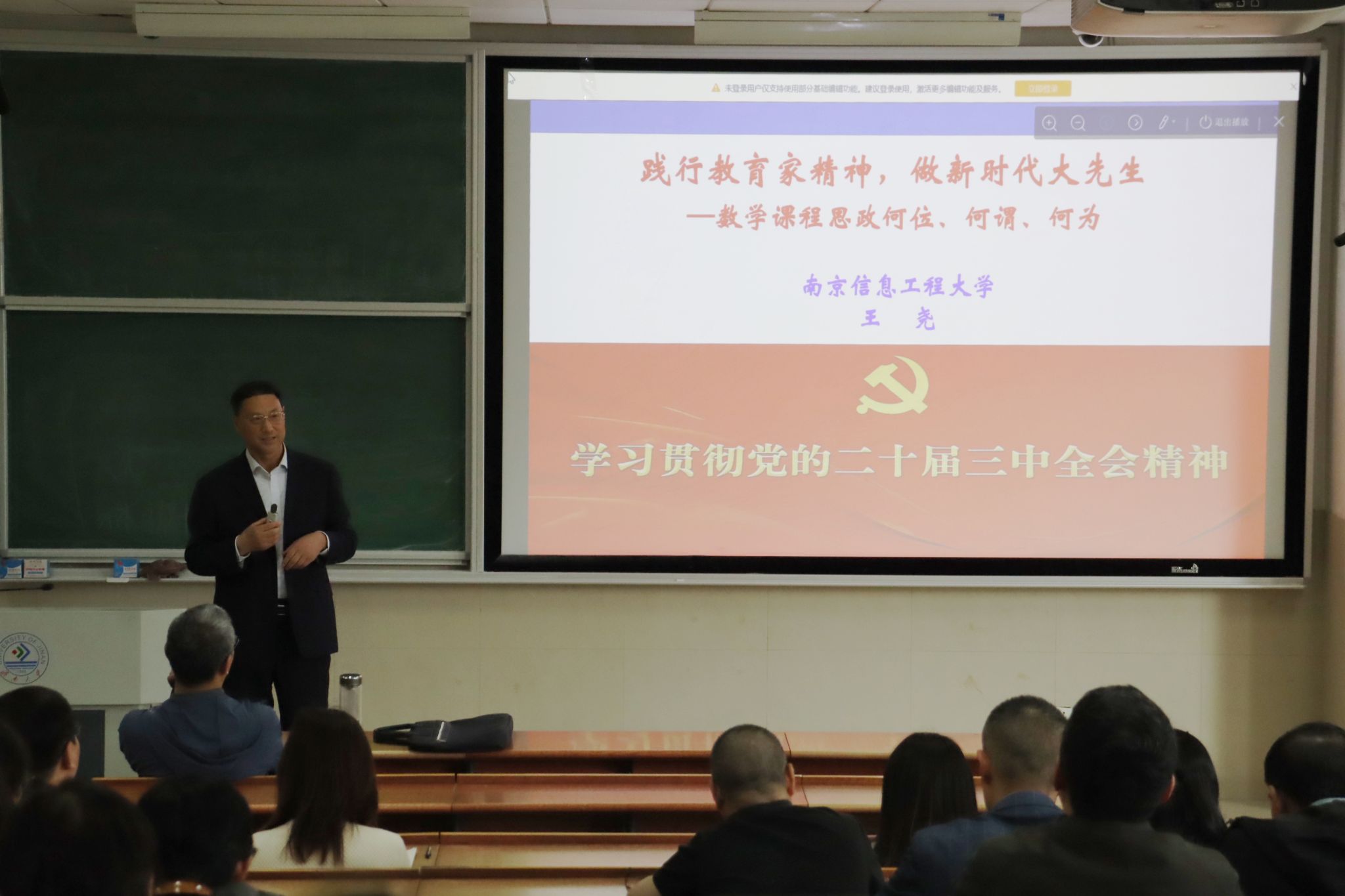 为贯彻落实立德树人根本任务,深入推动今年会官网“课程思政”建设走深走实,全面提升人才培养质量,5月6日下午,南京信息工程大学原党委副书记、副校长,博士生导师王尧教授来院为师生作题为“弘扬教育家精神,做新时代大先生——数学课程思政何位、何谓、何为”的专题报告。学院全体领导班子成员及全体教职工参加会议,会议由学院党委书记崔英静主持。