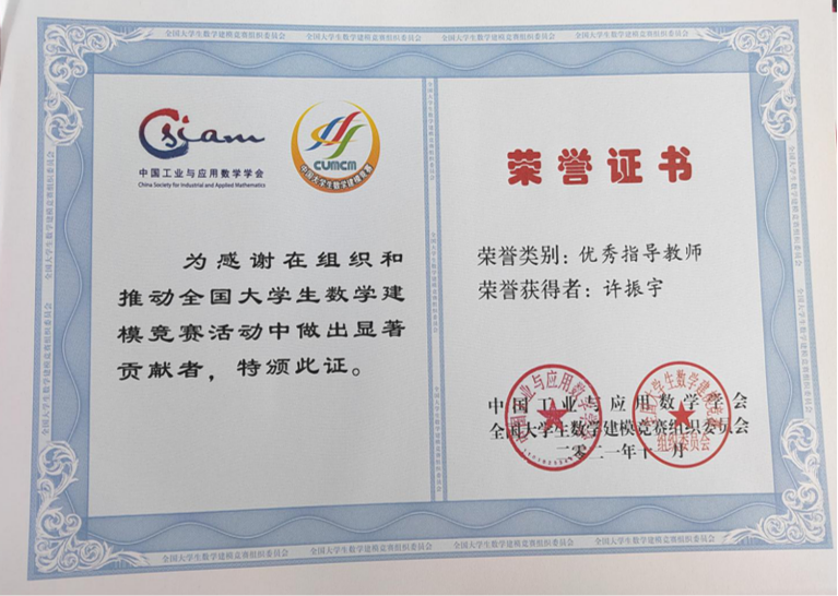 近日,庆祝全国大学生数学建模竞赛30周年暨2021“高教社杯”竞赛颁奖典礼以线上会议的方式举行,线上主会场和第一分会场设立在重庆市渝州宾馆。我院数学建模中心的许振宇老师被授予“全国大学生数学建模竞赛优秀指导教师”。数学建模指导中心的许振宇、吴鸿华、李尚友、邱保建、孙鹏举、屈忠锋、刘艳、刘春燕、何燕玲等9名指导教师被授予数学建模竞赛30周年银质奖章。