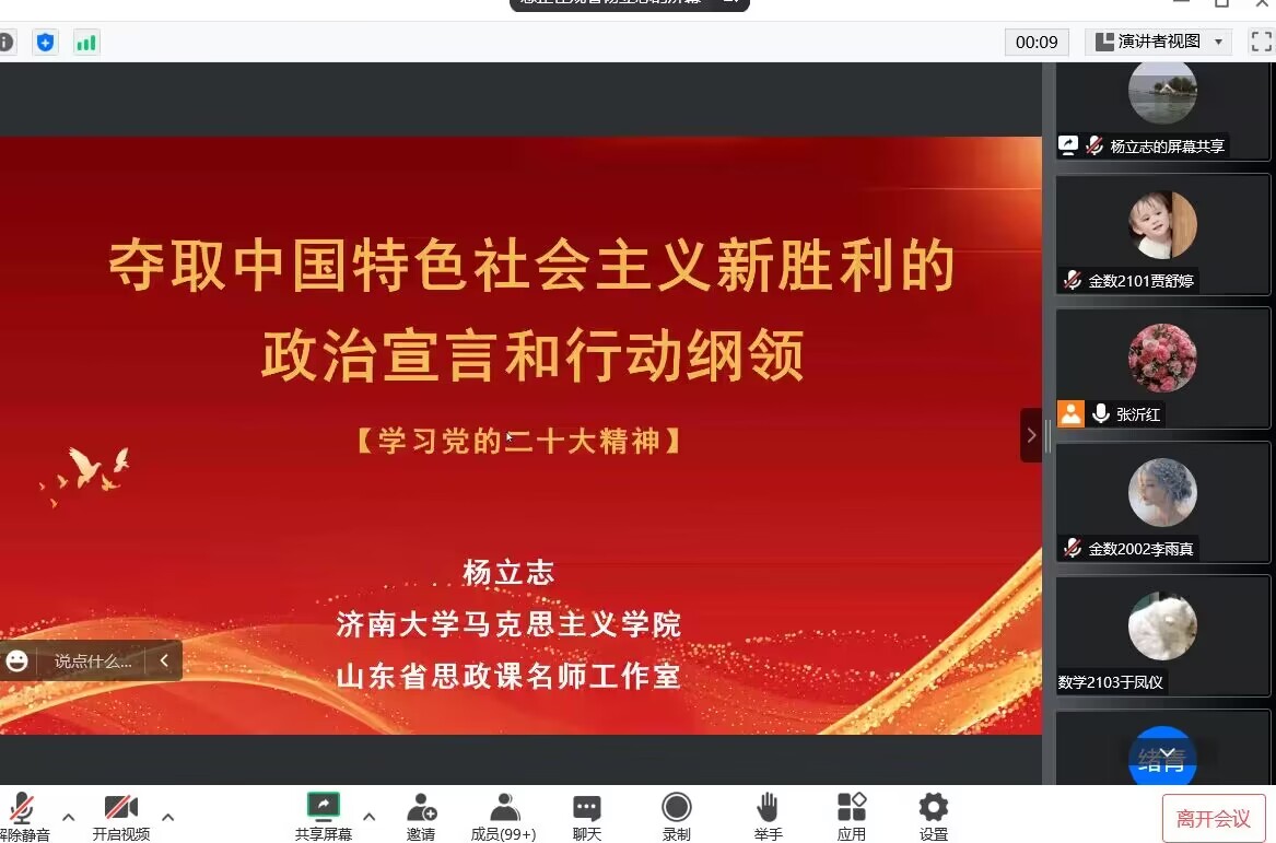 11月22下午,学院邀请校宣讲团成员、山东高校思政课教学名师工作室主持人、马克思主义学院副院长杨立志教授为学院党委班子成员、全体学生党员、学院学生会和研究生会部长及以上成员、各年级各班全体学生干部等300余人宣讲党的二十大会议精神。杨教授作了题为《夺取中国特色社会主义新胜利的政治宣言和行动纲领》的专题报告。他从战略定位、大会主题、实践基础、理论指导、基本路径、根本保证、团结要求等七个方面全面解读了党的二十大报告的主要内容,并就中国特色社会主义道路生成逻辑、伟大建党精神的形成过程和丰富内涵、“五个牢牢把握”等相关内容作了深入讲解。学院党委副书记、副院长张沂红在主持学习活动时强调,深入学习宣传贯彻党的二十大精神是当前和今后一个时期的重要政治任务,广大师生党员、学生干部要通过全面深入的学习,不断提高政治站位,广泛凝聚思想共识,以强烈的政治责任感和历史使命感,坚定自信,团结奋斗,努力为开创学校工作新局面贡献力量。