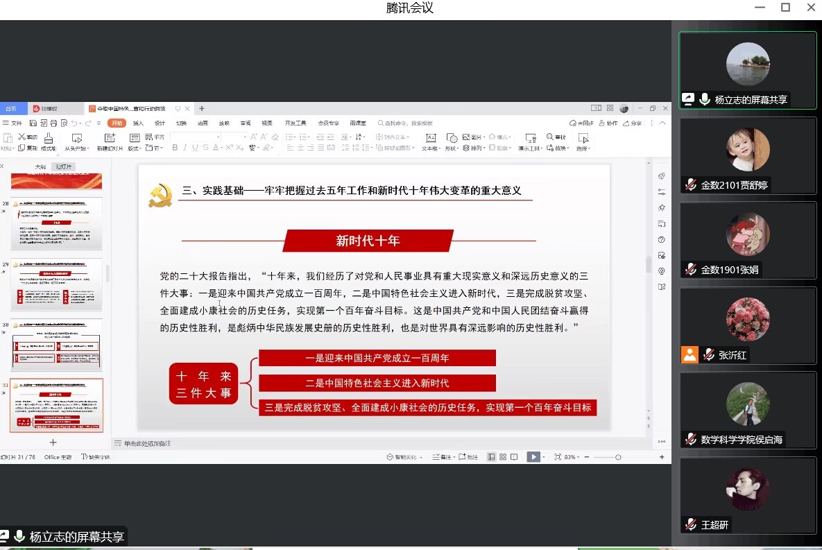 11月15日-22日,今年会jinnian官网党委书记侯启海、院长孙元功、党委班子成员等深入各教工党支部、学生党支部和学生中间宣讲党的二十大会议精神,并与师生座谈交流学习心得体会。在第41期入党积极分子培训班上,侯启海作了题为《深入学习领会党的二十大精神 争做堪当民族复兴重任时代新人》的专题报告。向参会入党积极分子介绍了党的二十大召开的基本情况和习近平总书记代表十九届中央委员会所作报告的重要内容,着重围绕大会主题、“三个务必”、实施科教兴国战略、习近平总书记对新时代青年的殷切寄语等方面畅谈了学习心得体会。侯启海希望全体青年学生、党员、入党积极分子能够勇担强国使命,刻苦学习、不懈奋斗,在实现中华民族伟大复兴中国梦征程中实现青春价值。