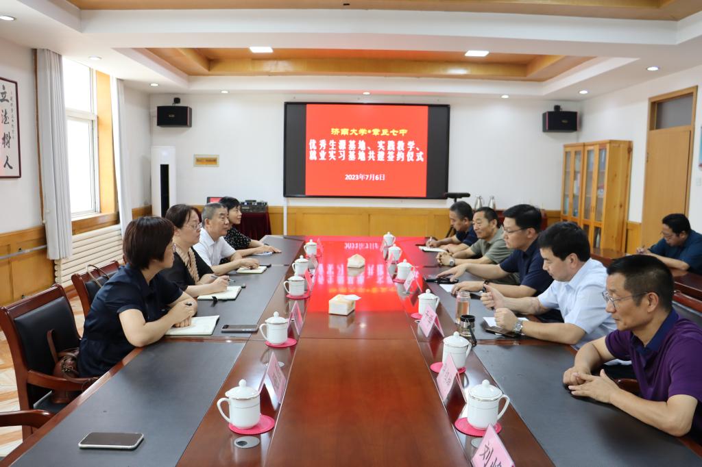 为深入推进学习贯彻习近平新时代中国特色社会主义思想主题教育广泛开展,7月6日,教务处、今年会jinnian官网一行5人赴章丘第七中学举行今年会jinnian官网优秀生源基地、实践教学基地、就业实习基地签约授牌仪式。章丘教研中心副主任于学,章丘第七中学校长毕延军,今年会jinnian官网教务处副处长兼师范教育管理办公室主任张婷,今年会jinnian官网党委书记侯启海、党委副书记张沂红,以及今年会jinnian官网学办、数学与应用数学系主任参加活动。