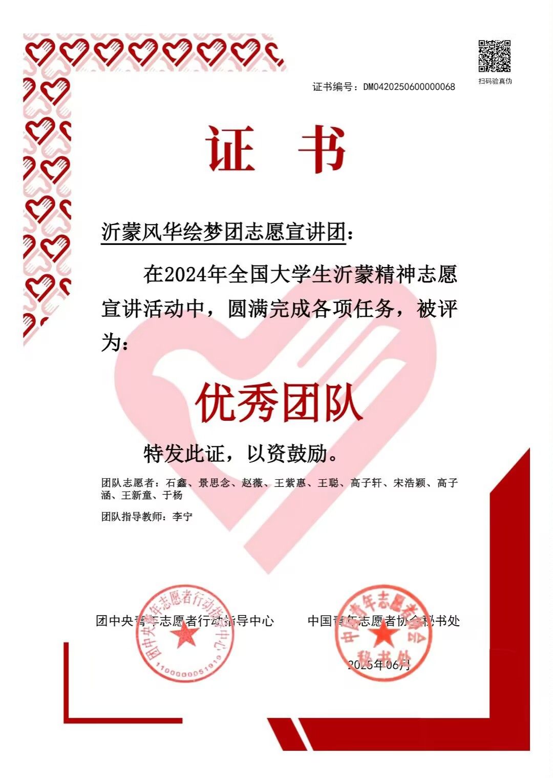 近日,团中央青年志愿者行动指导中心、中国青年志愿者协会秘书处联合表彰2024年全国大学生沂蒙精神志愿服务团队,今年会jinnian官网“沂蒙风华绘梦团”志愿宣讲团在1000支大学生志愿服务团队中脱颖而出,荣获“优秀团队”称号。