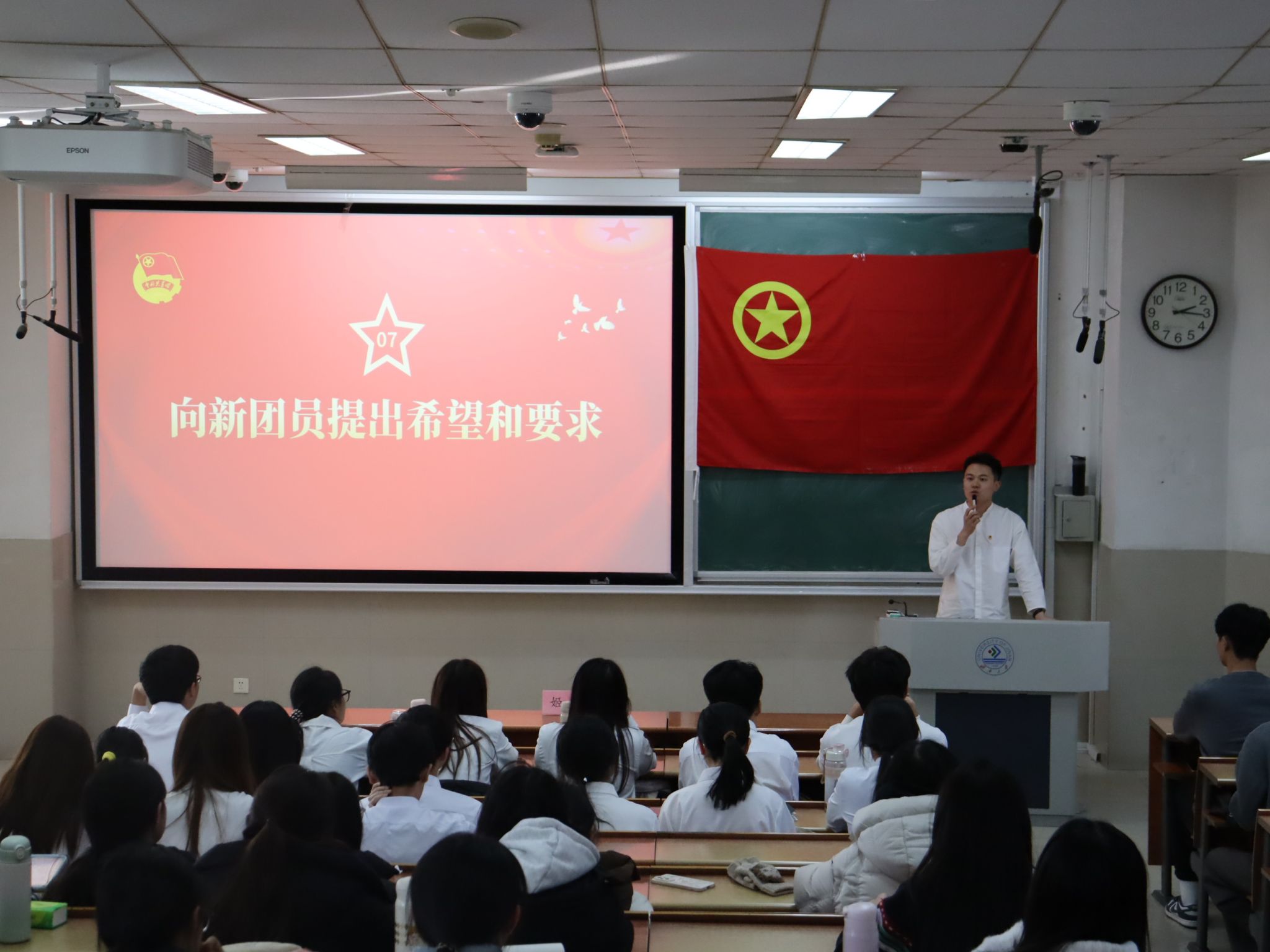 姬磊宣读了新团员名单,并为新团员佩戴团徽、颁发团员证。随后,在领誓人赵卓娅的带领下,新团员面向团旗庄严宣誓。