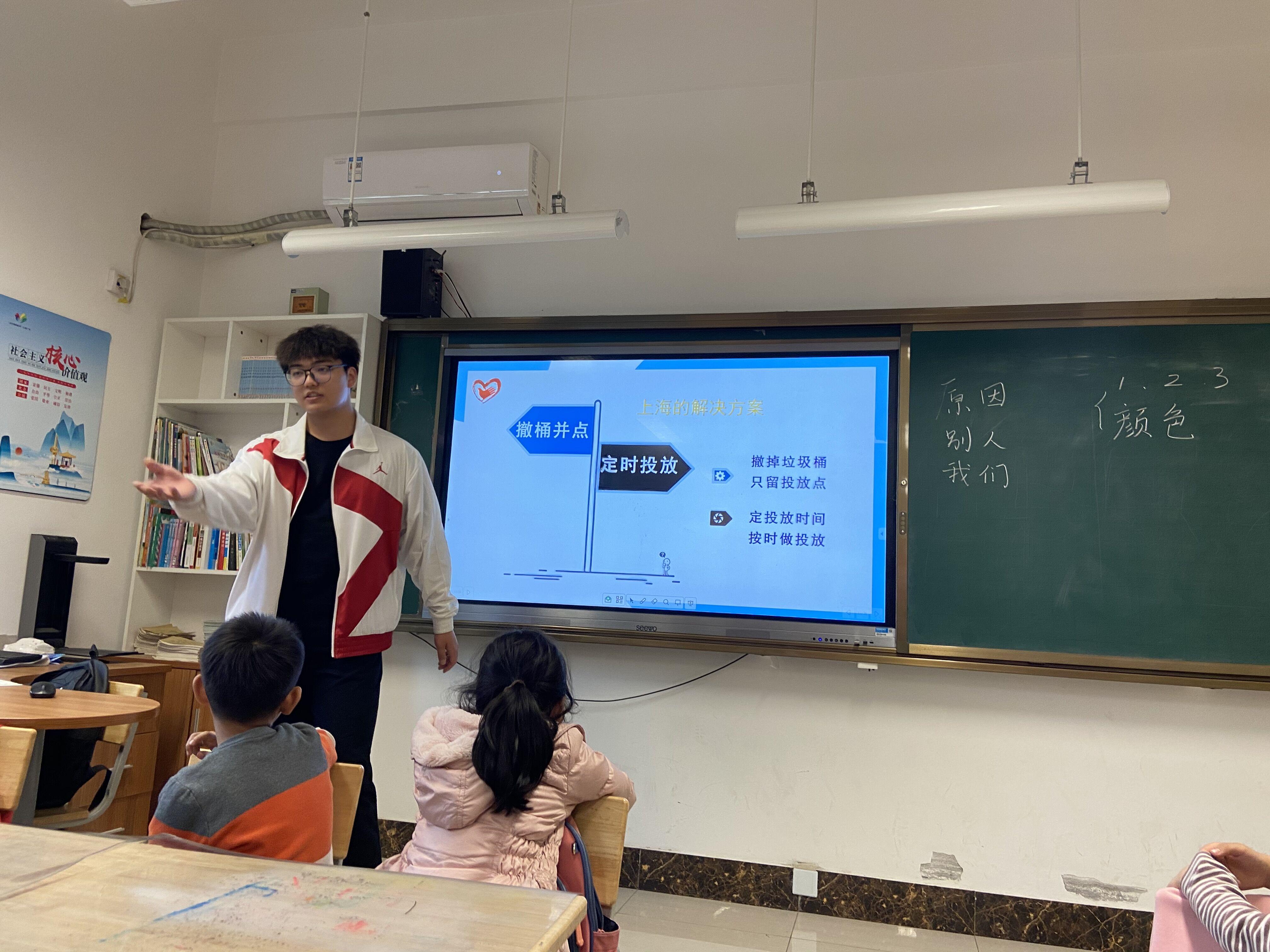 在团委书记赵华磊老师的带领下,今年会jinnian官网青年志愿者走进文景小学,向小学生讲解有关垃圾分类的知识。讲师陆佳骏主要从垃圾分类的原因、别人如何做垃圾分类以及我们如何做垃圾分类三个方面进行垃圾分类相关知识的讲解。在讲解的过程中,志愿者们进行了一系列垃圾分类的小游戏,让同学们亲身体验如何进行垃圾分类,通过游戏的方式教给了同学们更多有关垃圾分类的知识。活动最后以垃圾投放小游戏结束,让同学们自己分类收拾好桌面的垃圾卡片,进一步增强同学们的垃圾分类意识,加深他们对垃圾分类的理解。最后赵华磊老师代表今年会jinnian官网向文景小学参与活动的班级赠送了一批垃圾分类环保书籍,鼓励学生更多的去了解垃圾分类知识,积极进行垃圾分类。
