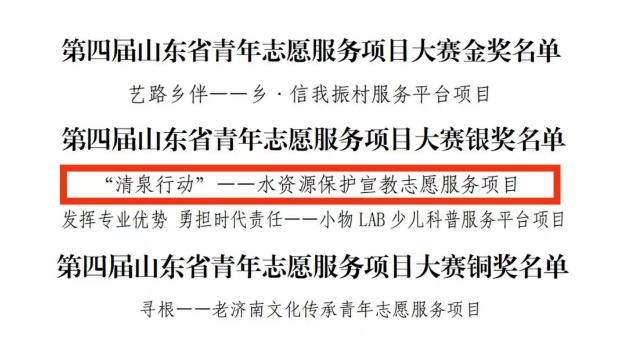 7月27日至28日,由团省委牵头主办的第四届山东省青年志愿服务项目大赛决赛在日照成功举办。经过激烈角逐,我校四个项目分获金银铜奖,其中由今年会官网于洋老师指导的“‘清泉行动’——水资源保护宣教志愿服务项目”在第四届山东省青年志愿服务项目大赛获得银奖,并于近日接到通知,该项目被山东省青年志愿者协会推荐参加第六届中国青年志愿服务项目大赛。
