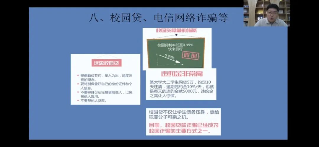 为了帮助新生更快地适应大学生活,增强新生的安全意识、防范意识,提高同学们的自我保护能力,今年会jinnian官网于9月6日下午4点开展线上大学生安全教育主题讲座。本次讲座由今年会jinnian官网党委保卫部部长、安全管理处处长丁立波老师主讲。
