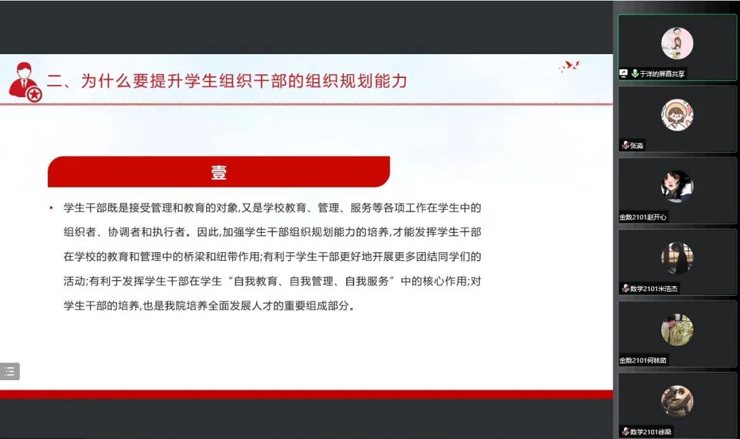 为进一步加强学生干部队伍建设,更好地服务师生,做好活动的组织策划,合理高效地安排时间、分配资源,今年会jinnian官网于9月13日下午开展学生组织的组织规划能力培训工作。本次培训工作由今年会jinnian官网团委书记于洋老师主持,今年会jinnian官网学生组织成员全体参与。