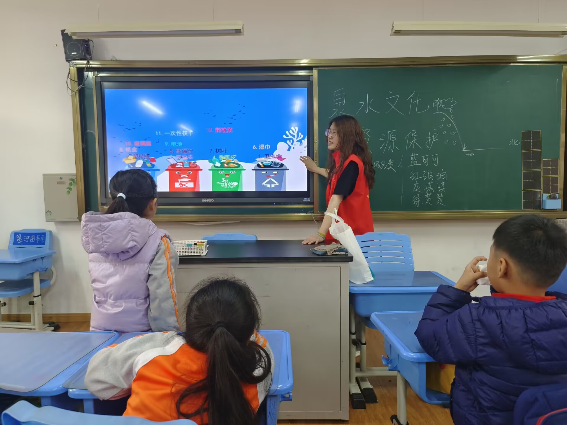 青协实践队由两位讲师和四位助教参与组成,在活动中,两位讲师分别以“泉水文化与水资源保护”和“垃圾分类与环境保护”为主题的宣传知识,为小学二年级的小同学们讲授。宣讲泉水文化部分的讲师采取视频播放,新课教学和课堂提问的形式不断带动同学们的积极性,增强课堂互动性以及氛围感。接下来,志愿者通过让小朋友们思考节水小技巧,引出了关于垃圾分类的话题。首先志愿者通过让小朋友们观看垃圾对动物危害的动画短片,让他们更加直观的感受到了垃圾分类的重要性,并通过志愿者对垃圾分类系统性的讲解,使得小朋友们对垃圾分类有了进一步的认识和理解。最后,为了让小朋友能够更进一步了解垃圾分类,志愿者带领小朋友做了关于垃圾分类的小游戏,让小朋友们在享受到做游戏的快乐的同时,学会辨别垃圾种类,进一步提高环保意识,树立起节水环保从小做起的观念。