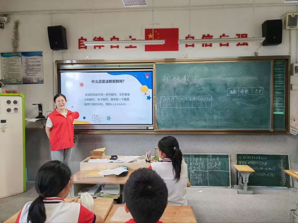 志愿者们首先通过简单有趣的数字魔术引入课堂,让同学们按斐波那契数列递推公式求得第十二项,由授课志愿者反推出初始数值,小小的数字魔术引起同学们的阵阵惊呼。紧接着,志愿者们又向同学们介绍了斐波那契数列、黄金分割、视觉错觉与数字陷阱等内容,用生动形象的语言向同学们展示了数学的神奇之处,同时也充分展现了数学的魅力与趣味。接下来,志愿者们又通过“神奇的数字”小游戏寓教于乐,带领同学们感受数字的奇妙乐趣,使同学们沉醉其中。最后,志愿者们灵活地借用清楚易懂图片和例子,详细讲解了黄金分割,让同学们感受到了数学的无穷魅力。