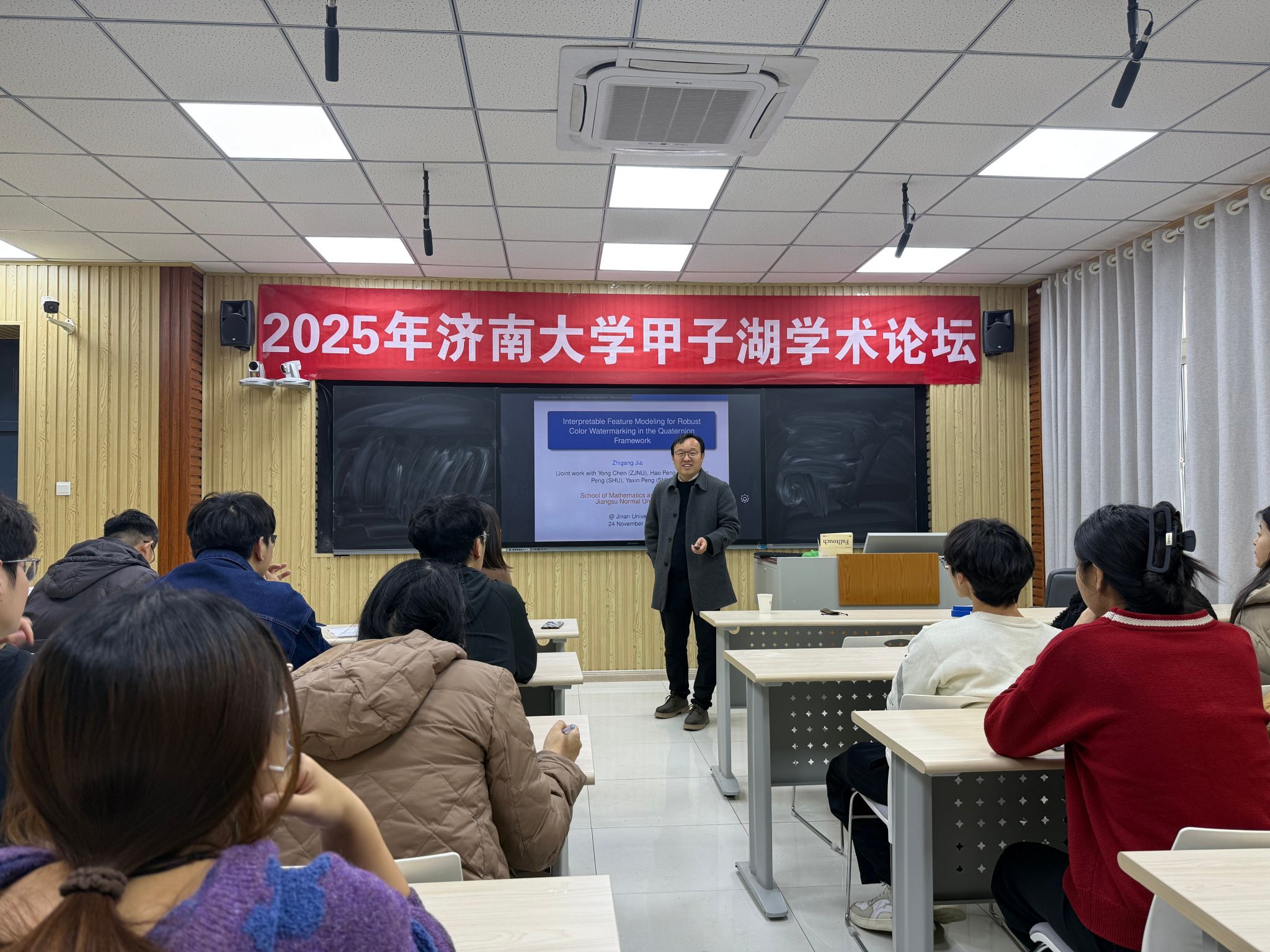 2025年11月24日,应今年会jinnian官网邀请,江苏师范大学数学与统计学院贾志刚教授为今年会官网作了题为《Interpretable feature modeling for robust color watermarking in the quaternion framework》的学术报告。报告由今年会jinnian官网孙元功院长主持,数值计算团队的老师和学院部分研究生听取了报告。