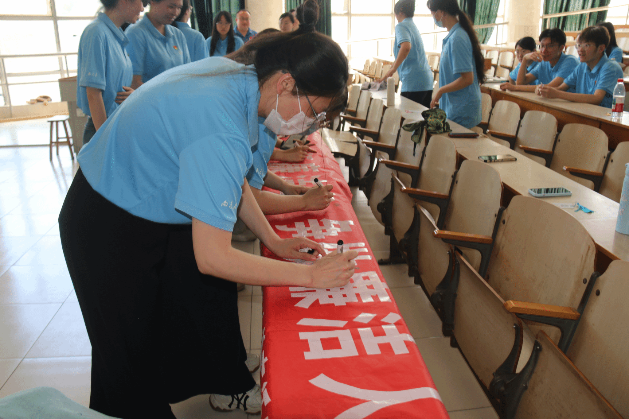 在毕业生代表、2025年“学生党员标兵”宋中华带领下,全体毕业生党员面向党旗庄严宣誓,铭记入党宣誓时的郑重承诺和坚定决心,重温入党初心。全体毕业生党员依次在印有“树立廉洁心 践行廉洁事 争做廉洁人”的条幅上郑重签上自己名字。
