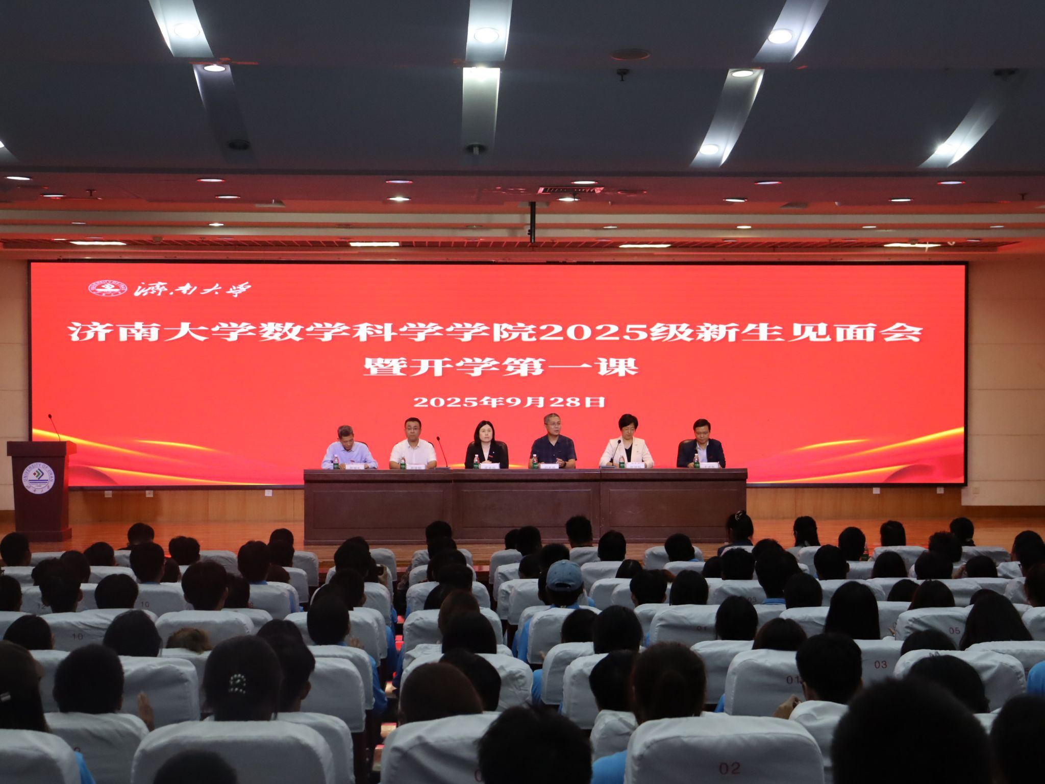 悠扬的校歌缓缓响起,学院领导、新生班主任为新生代表佩戴院徽。这枚院徽不仅象征着数学人的身份与责任,更寄托着学院对“后浪们”的殷切期望。