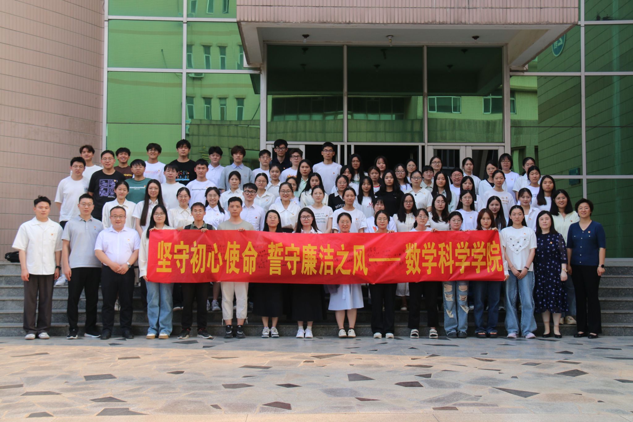 在毕业生党员代表李岩键带领下,全体毕业生党员重温入党誓词,并在印有“坚守初心使命 誓守廉洁之风”的条幅上郑重签名。