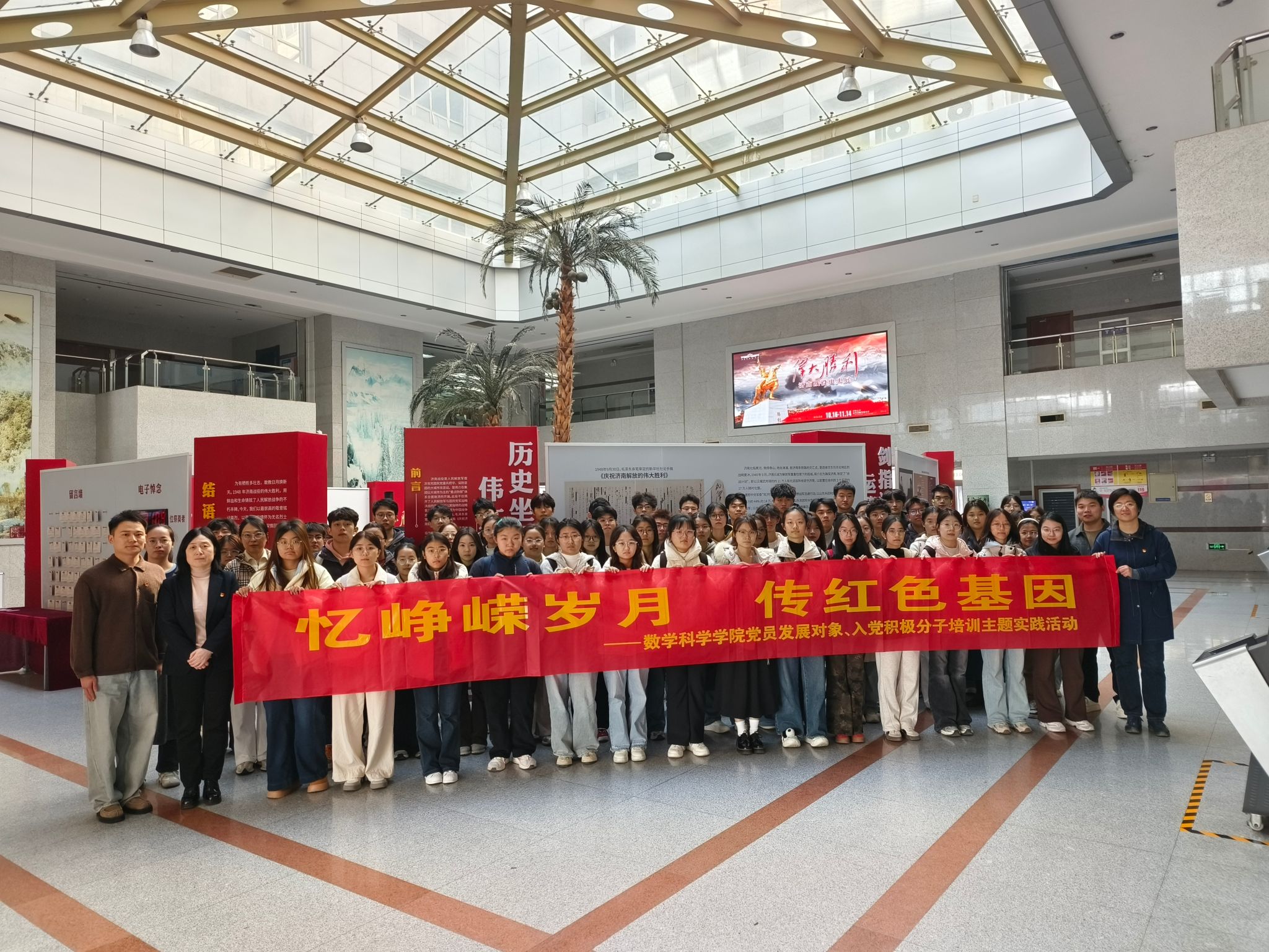 为深入学习贯彻党的二十届四中全会精神,厚植爱国情怀,传承红色基因,2025年11月4日,学院组织2025年下半年党员发展对象、第47期入党积极分子和新发展团员集体参观“伟大胜利-济南战役史实展”,开展“忆峥嵘岁月,传红色基因”主题实践活动。学院党委书记崔英静,党委副书记、副院长张沂红,各学生党支部书记参加,活动由学院党委组织员刘璟主持。